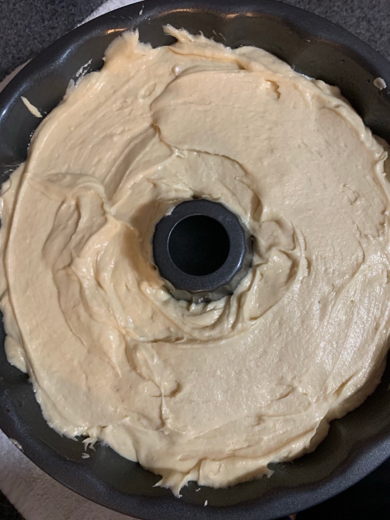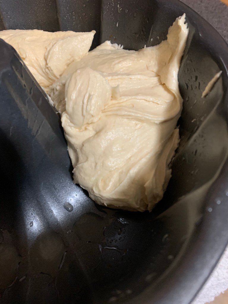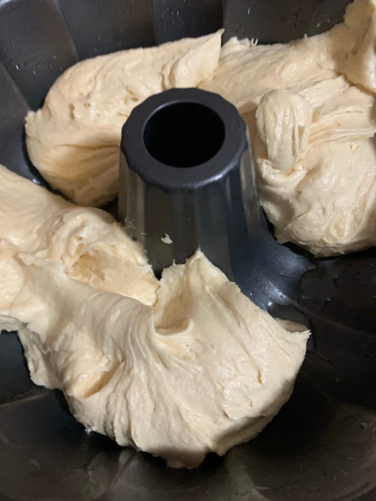 - Grease a bundt pan and dollop batter into pan. Tap down to release air and fill in holes.