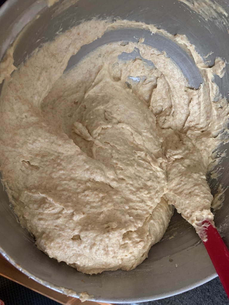- Scrape down the bowl and add eggs. This batter will look like it is breaking but be patient.