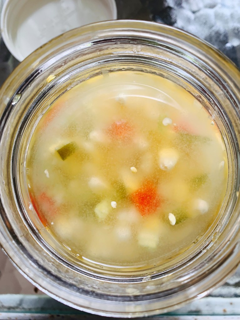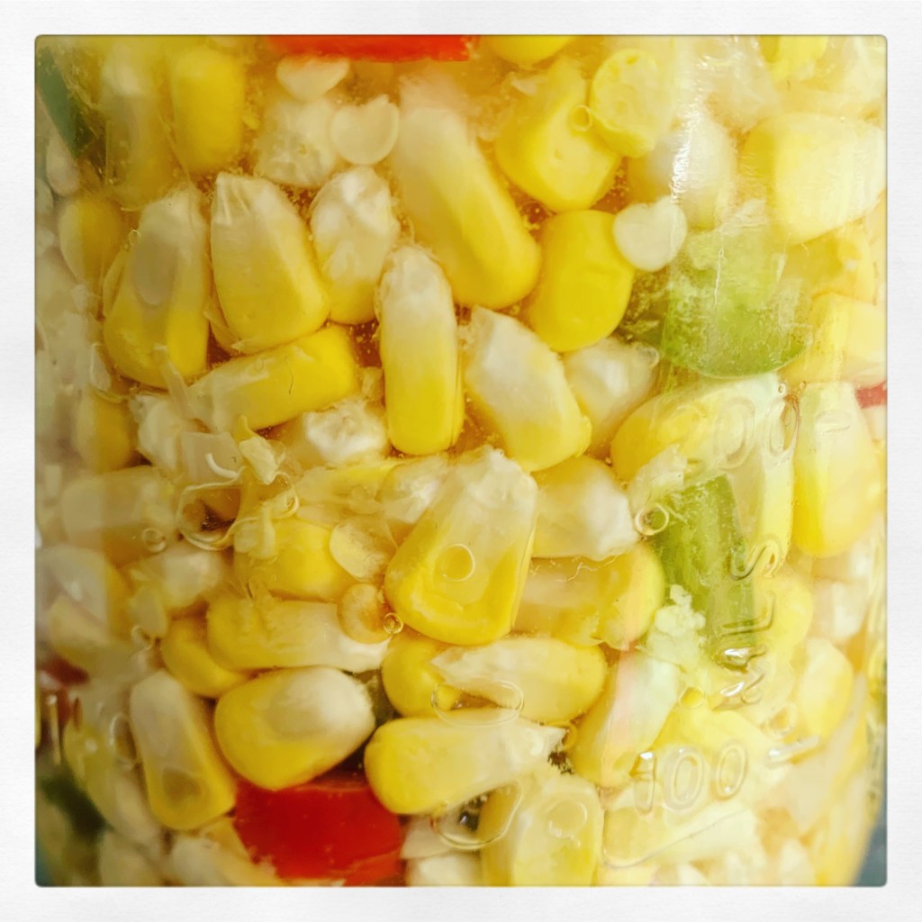 - To a sterile crock or glass jar, add corn kernels, peppers and garlic.
