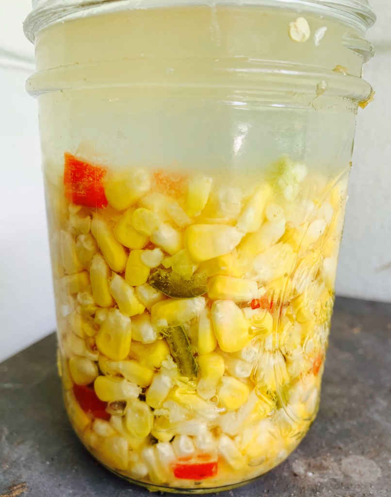 - If it tastes good to you (the corn should have a sour and slightly funky flavor, and still have its sweetness), transfer to a jar if using a crock, otherwise place lid on jar, label & date, and store in the refrigerator. It can last several months, but be sure to keep kernels submerged in brine. This is a live product so the flavor can and will change.