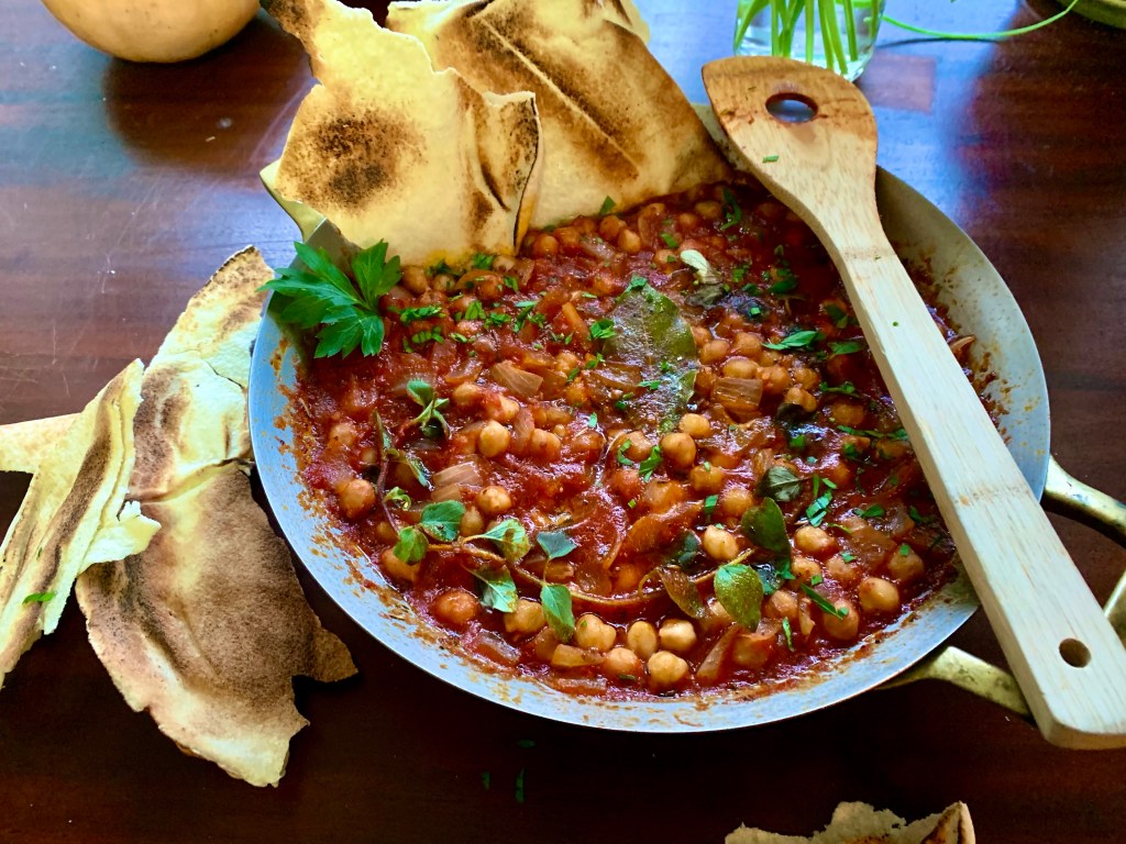 In a town 30 minutes northwest of Tampa lies Tarpon Springs, a lively coastal town tucked away in Tampa Bay. Its waterways made it a landing place for sponge harvesting and shrimping. Up until the late 1800’s sponging was being done on boats with long poles stabbing blindly and pulling them up to the surface. But Greeks off the coast of the Dodecanese Islands had learned how to dive for sponges and in the early 1900’s this technique was brought to Tarpon Springs along with the Greek divers. The sponge economy boomed. Tarpon Springs became one of the largest Greek settlements in the US and as a result incredible authentic restaurants and bakeries are still here today. On my last visit we had lunch at a waterfront restaurant and ordered the Greek braised chickpeas. I knew I had to add these to the rotation when I got home.