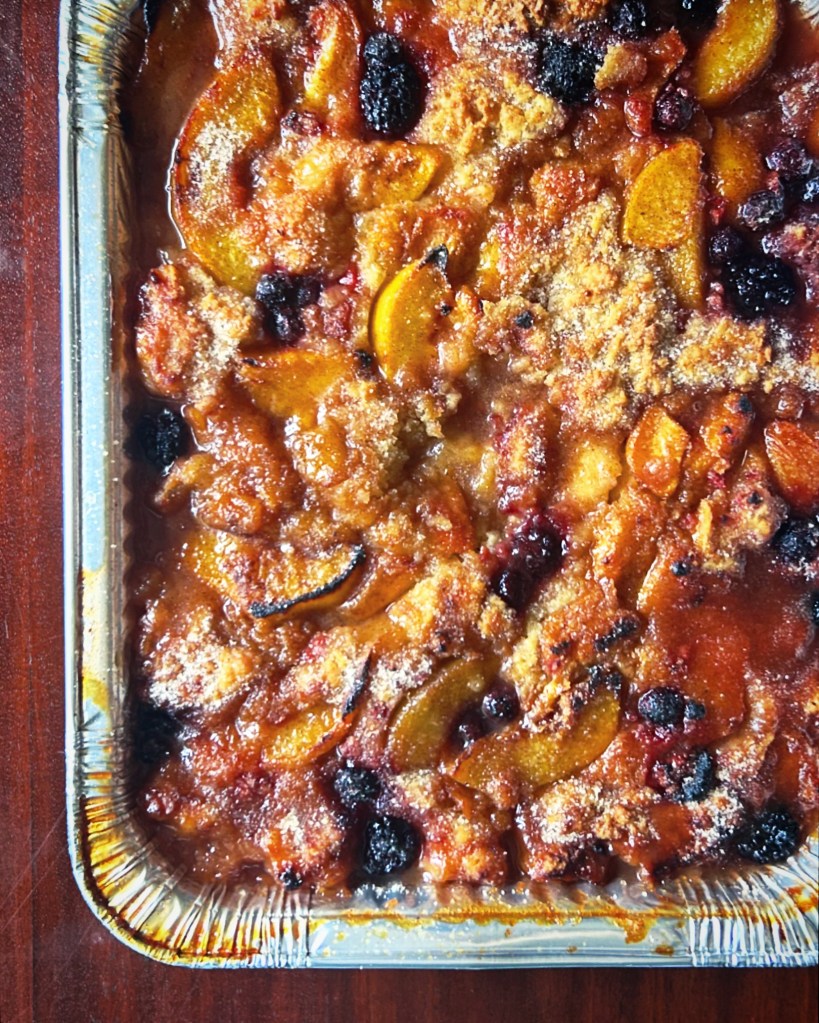 Originally, I made this with peaches and blueberries, my dad’s favorite. But I have landed on using yellow and white peaches, blackberries, raspberries, and blueberries and man is it an incredible flavor combination.